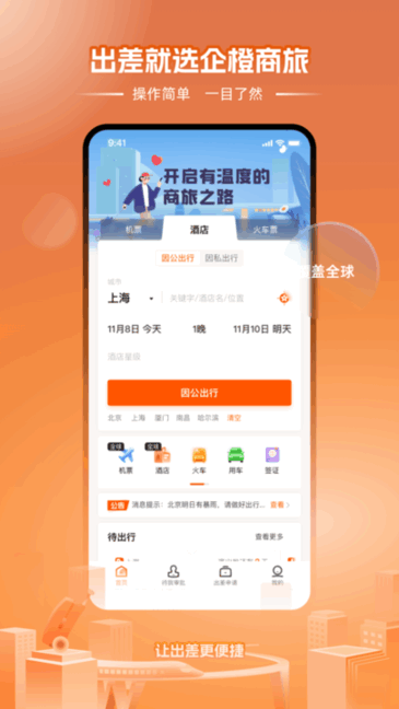 企橙商旅APP是一款专为企业用户设计的差旅管家式服务应用,帮助用户轻松解决企业差旅问题。企橙商旅APP涵盖了企业差旅管理的所有场景需求,包括机票、酒店、用车、火车票以及火车票购买业务等等,满足用户的多样化需求。