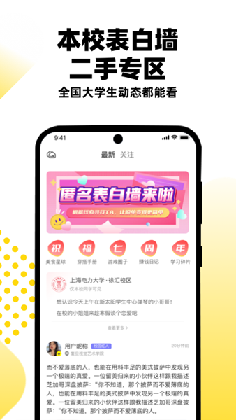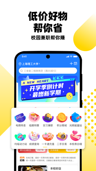 汇集各地优质商家入驻本校,实现同城社交互助,促进学生间的互动交流。