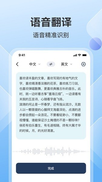 -根据用户习惯调整翻译策略,例如自然语言、中文等,增强了翻译效果和用户体验。ai翻译app是一个非常强大的输入法,可以让大家在手机上进行语音转换文字内容的软件。支持拍照、文本和图片等各种形式的实时在线交流方式哦!让你快速获取到最准确的翻译结果。欢迎下载使用。
