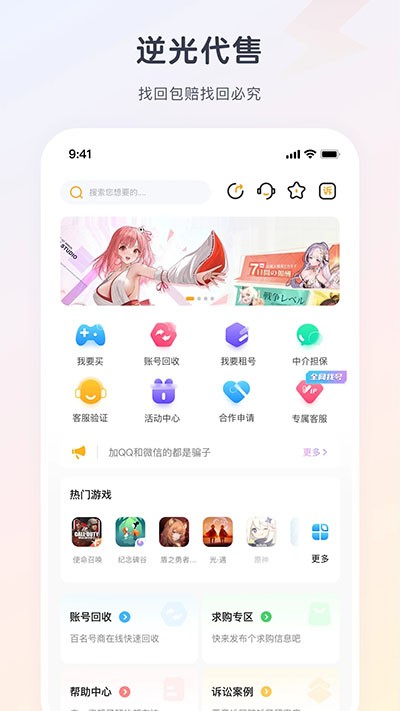 逆光代售是款相当不错的手机端游戏交易软件,通过开启用户们可以快速进行各种手游和端游的账号出售。方便的功能体验和超多功能选择也是让用户朋友们轻松购买到自己想要的产品和服务信息