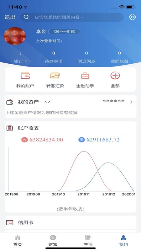 2、登录账号后,进入主页面之后,我们可以看到“账户”模块,这里有着账户的基本信息及资金明细可查,如果需要开通信用卡的话,点击下方的申请卡即可开始申办了;