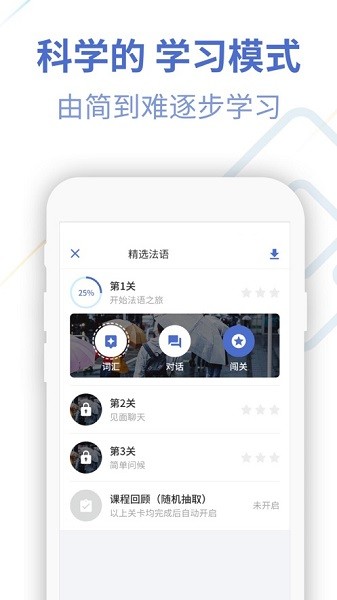开启之后我们可以快速进行法语课程知识获取和学习。软件用起来比较简单适合我们进行选择和体验,想要轻松学习法语的朋友不妨速速下载体验吧!