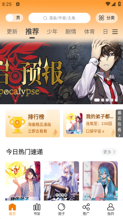 酷漫熊app是最近非常火爆的漫画阅读器,在该平台上有着海量的漫画资源可以供用户们选择进行免费观看哦,而且在这里还有很多热门日漫、国漫、美剧、韩漫等等内容可自由的选择观看。另外,在酷漫兔app里面还提供了一些免费的番外书籍和漫画可以看,喜欢看漫画的朋友们可以下载试试看!