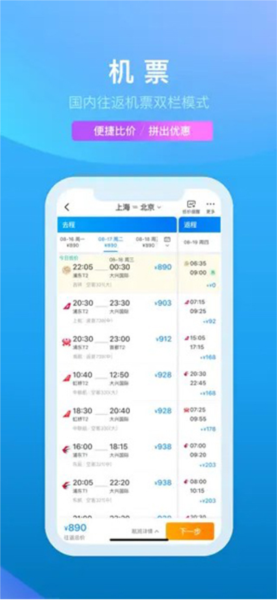 •机票:覆盖世界500强/地区及各大航班信息,价格透明公开明了,手机即可抢票,随时随地轻松下单。