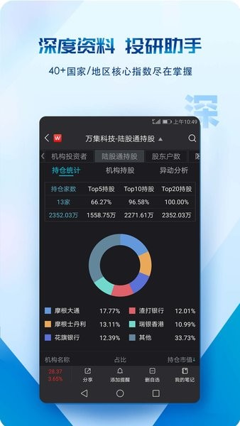 提供机构基本面、机构持仓、机构评级、机构持仓、机构持仓、机构持仓等信息;万得股票()是一款由中国市场投资局为投资者提供最新交易信息的手机应用软件,该平台提供了全球最新的股市行情和基金交易情况。用户可以在这里查看到详细的股市数据变化,帮助你把握投资机会,感兴趣的朋友欢迎使用西西下载!
