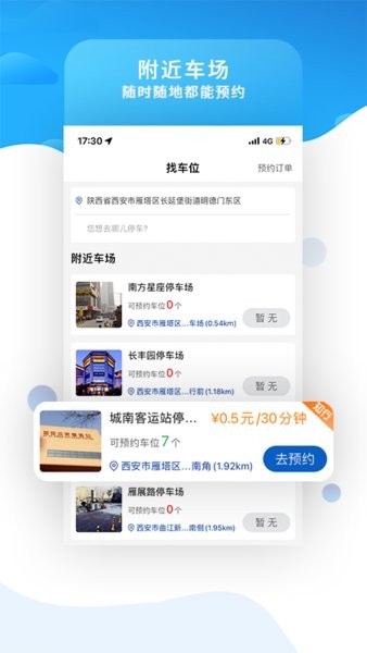 1、随时都能进行定位查找附近停车场并线上操作预约停车服务。