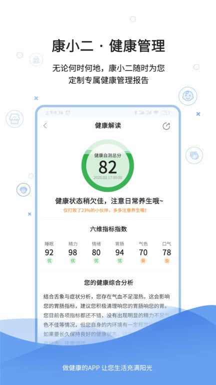 康小二,一个专为改善身体健康设计的手机软件,它提供了一系列健康工具、功能和服务,帮助他们实现健康的目标。它不仅支持健康记录、数据分析和报告生成等功能,还支持在线咨询客服以及社交分享功能,让大家更好地享受健康生活的便捷体验。