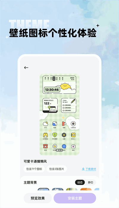 灵动小组件app是款超火爆的桌面美化工具,提供多种类型和风格,让你的桌面与众不同,不仅拥有各种各样的主题、壁纸资源,还提供了丰富的DIY素材供你挑选,让你的手机变得更加独特和有趣,快来下载吧!