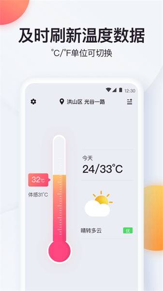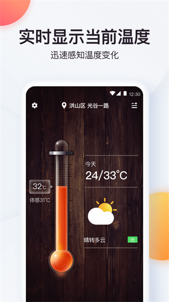 精准的实时温度计,支持国内外各大城市,24小时天气预报及逐小时天气预报,温度变化提前知晓。