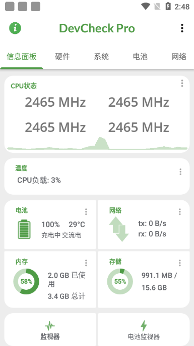Pro破解版是一个专业的手机硬件检测工具 dnCheckpro破解版为用户提供了非常详细的硬件信息和系统配置,让用户在使用软件时更加方便。软件中有很多实用的功能供用户选择!它可以帮助您了解您的设备,从而更好地调整设备的工作原理、性能和性能。这是一款专业级的应用程序,旨在于为您提供全面的信息支持和服务。