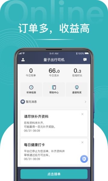 量子出行app,是为广大司机们打造的一款智能网约车应用,使用这款软件你可以在手机上随时随地轻松抢单,同时还能通过该APP查看最新的订单信息和位置地图等内容哦,欢迎大家来绿色资源网下载使用!