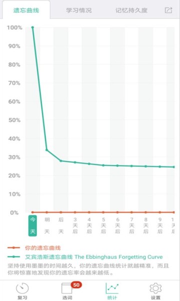 基于遗忘曲线设计的智能评估算法能够对用户的记忆状况进行详细分析并给出建议。