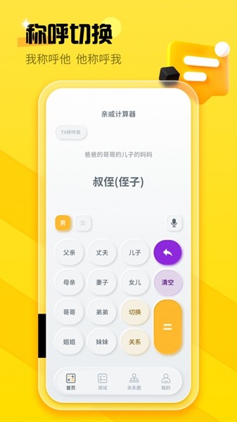 亲戚称呼计算一款亲密度计算器app,软件内置多种亲子关系、夫妻的关系等功能可以使用,帮助用户解决各种辈子的称呼问题。支持一键切换,操作简单方便实用,有需要的用户快来下载吧!