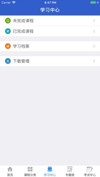 “学习中心”模块:主要包括个人信息查询、通知公告、学习档案、我的专题等服务;