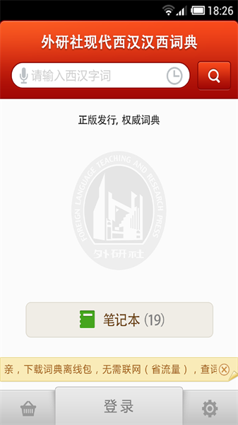 外研社西班牙语词典app支持离线查词、全文智能搜索等特色功能,能够快速帮助用户学习西班牙语,需要一款西班牙语的伙伴们快来下载外教社西班牙语词典app进行使用吧