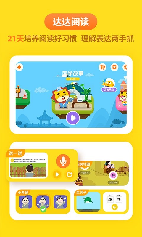 达达学院app是专为儿童打造的一款在线启蒙学习平台,提供专业的线上培训方式、优质的学习资源等服务,帮助孩子轻松掌握更多知识要点,提高学习成绩,让学习更轻松,有需要的朋友欢迎前来下载使用。
