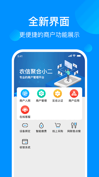 聚合小二是国家工商银行与农业银行合作推出的一款基于移动互联网平台,致力于打造一个集金融服务、金融产品和服务于一体的移动支付终端,为客户提供全方位、便捷的金融生活服务;以“惠企”为宗旨,为中小微企业、个体工商户及个人客户提供一站式金融服务和增值服务。