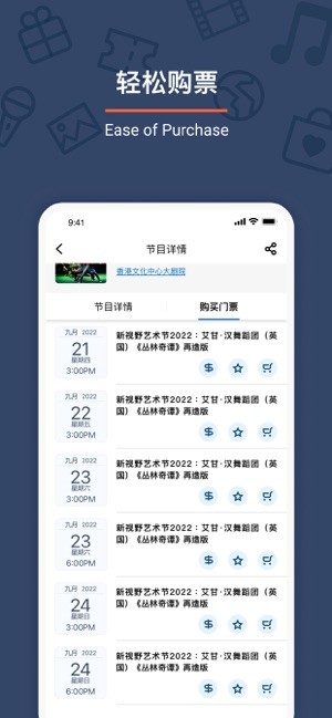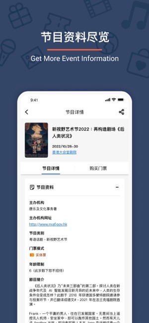 您可以从手机上挑选喜爱的演出,包括热门演出、展览和体育赛事。