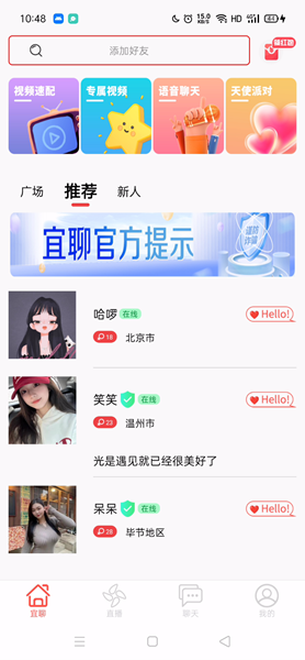宜聊交友app非常不错的手机软件,在宜聊交友app中你可以随时的在线进行聊天哦,而且宜聊交友app上还有很多的用户和你一起玩耍,喜欢的用户快来下载吧!