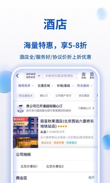 中国国内差旅出行预订用酒店预定APP()是国内国际酒店预订及预订的手机客户端。目前提供全国所有航线及国内外高铁动车、动车、专车以及高铁动车的航班动态信息与订票凭证数据共享。