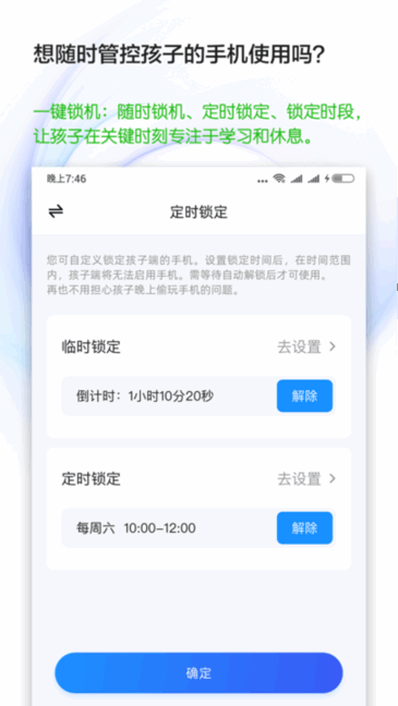1、为父母朋友们提供一个方便的远程控制功能,用户可以通过该软件实时监控和管理孩子使用手机时长。