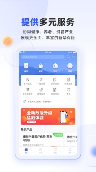 为用户提供便捷的生活服务体验。该应用程序提供了多种功能和服务,包括保单查询、理赔申请等,方便地查看和处理用户的保单信息;同时还具备了智能推荐系统,能够根据用户的需求推送相关的保险产品给用户选择合适的服务;此外,新华保险APP还可以与保险公司进行对接,实现在线投保或办理保险业务,节约时间和精力;另外,它还支持线上预约保单到家服务,让用户享受到更贴心的服务。