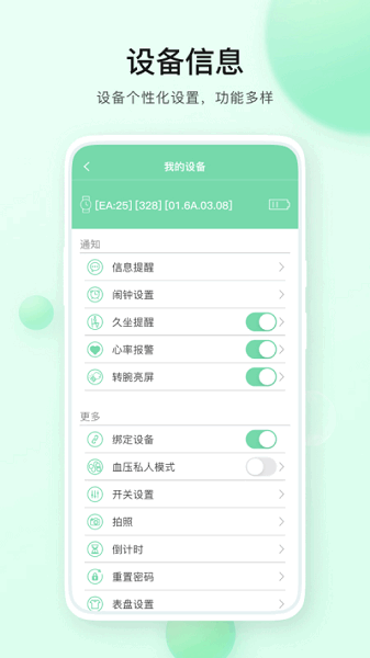 保存您的步数、睡眠、心率、心率和压力等健康指标,帮助您更好地掌握自身情况。用户可以使用本程序进行智能设备的连接。通过此应用程序可让您轻松地查看心率,血氧,睡眠质量,体温,呼吸,心跳等各种数据,以及详细的身体数据和睡眠质量报告。
