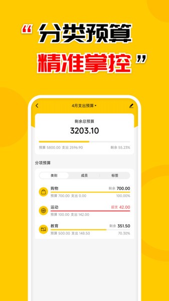 可自定义预算金额,实时监控你的账户消费情况,避免超支,让你清楚知道自己每月花费的比例。