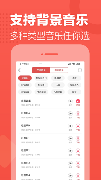 14、背景音乐:支持添加背景音乐到视频或图片上