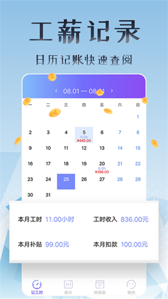 2、提供考勤签到功能,能够自动记录自己的上班天数以及加班时间等信息;