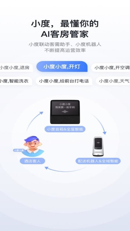 《小度酒店版》APP是百度旗下的专为酒店定制的手机App。它集成了百度旗下的所有智能硬件和工具,旨在为酒店提供更加智能、便捷、高效的智能化解决方案。无论你是酒店运营管理人员还是专业摄影师,这款应用都能满足你的需求,让你轻松驾驭各种场景。