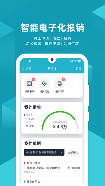 易快报是易快报的电子钱包客户端,通过易快报APP进行充值、缴费和报销业务处理;并提供手机支付、微信付款、支付宝扫码收款及发票开具服务;可实现对账单查询、报销记录分析、财务数据统计、个人信息管理与维护、财务报销申请办理、财务报销审批、财务报销报表生成等多种实用功能。