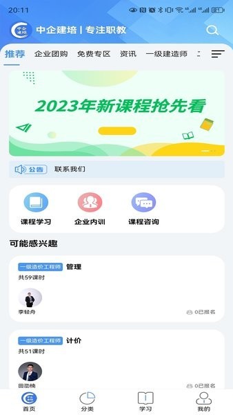 中企建培app是专为职业教育行业打造的线上培训应用,在平台就能直接查看相关的课程内容了,您才能了解许多优质的职业技能;以后就可以在这里快速的选择对应的课程使用,帮助您更好的整理自己需要的课程信息,这样才可以满足您的职称需求,为您节省更多的时间和精力;通过app还可以获取到相关的资讯动态,学生能够掌握到许多专业的技术数据,然后结合个人的需求即可找到合适的内容观看直播课!