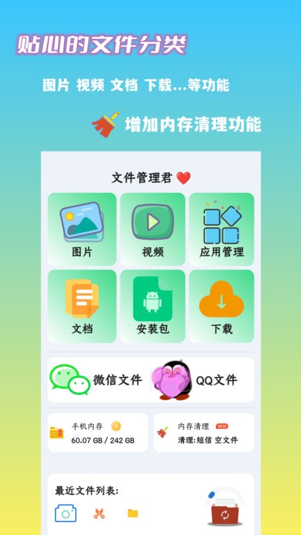 文件管理君是一款超级好用的手机文件管理软件,软件功能强大,提供文件压缩、文件解压、文件重命名、文件搜索、照片/视频播放、音频提取、应用程序排序、文件浏览、文件复制/移动/删除/复制/剪切/复制/重命名文件夹等多种功能。