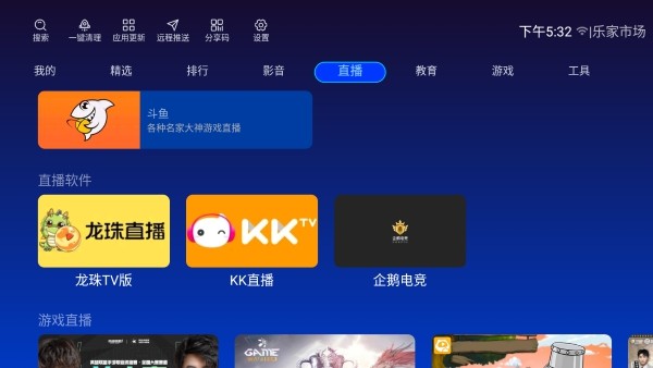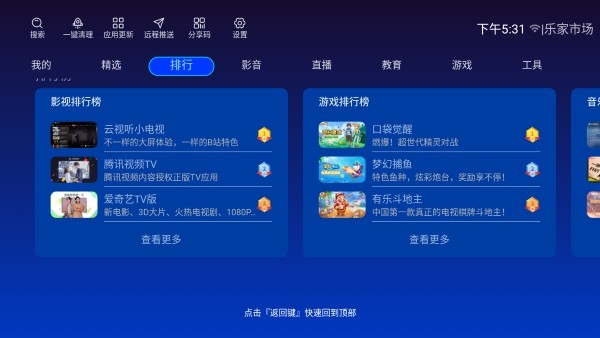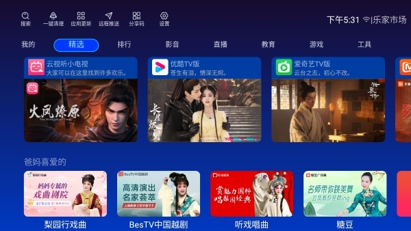 乐家里tv版是专为智能电视打造的应用商店app,拥有海量的电视直播等内容可以进行体验!并且所有的视频都支持高清画质播放哦,而且还可以一键清理缓存垃圾到电视盒子当中去观看更加稳定流畅不卡顿有保障随时都可以享受优质的服务服务吧~