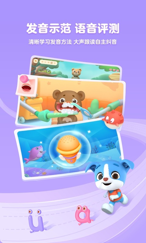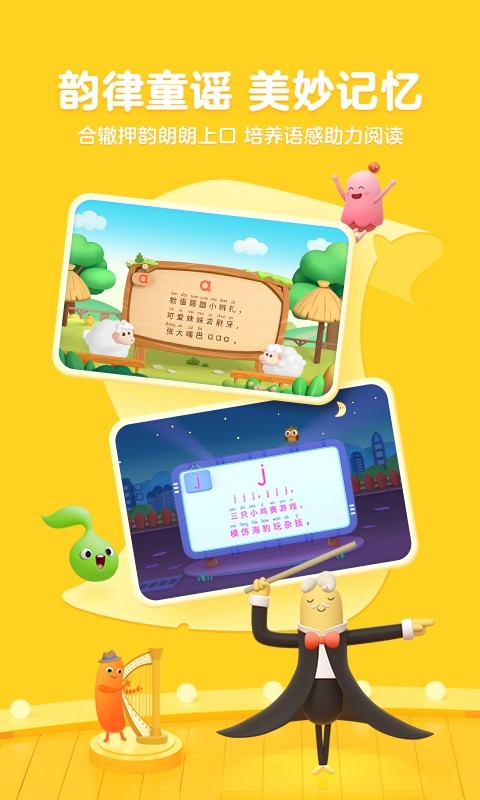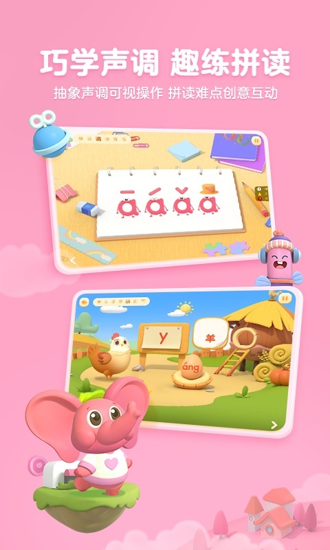 ◃——趣味学习:融合了朗朗上口的学习方式,让孩子通过趣味的互动体验,自主学习拼音。