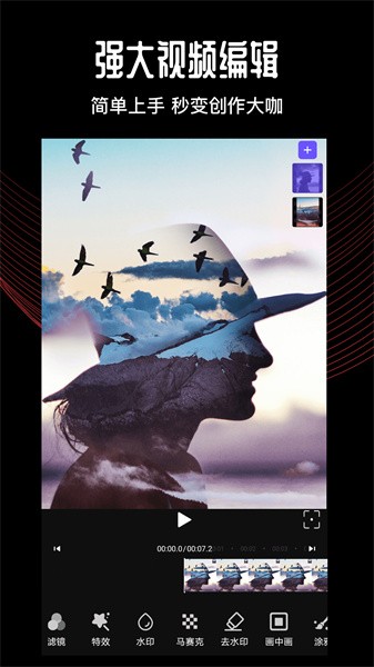 一款简单易用的手机视频剪辑软件。用户可自由选择视频片段、滤镜、字幕以及配乐等参数设置,快速制作精美的视频作品。