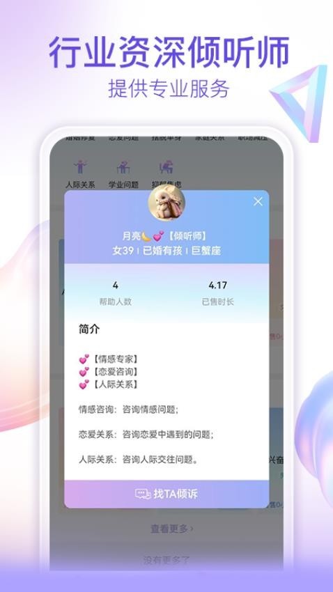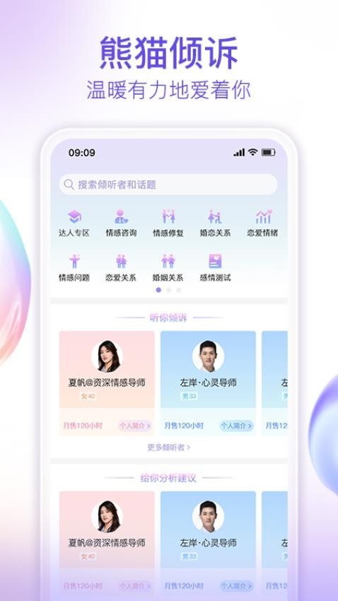 -熊猫倾诉app是一个专业可靠的线上心理咨询服务软件,熊猫倾诉安卓版汇聚了大量专业的心理咨询师和心理咨询师为用户提供一对一的专属情感辅导、心理测试等内容,