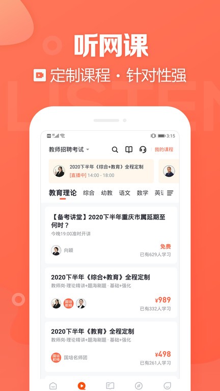 全国教师资格证、教师招聘笔试名师在线直播,可实时参与互动,体验真实上岸场景;