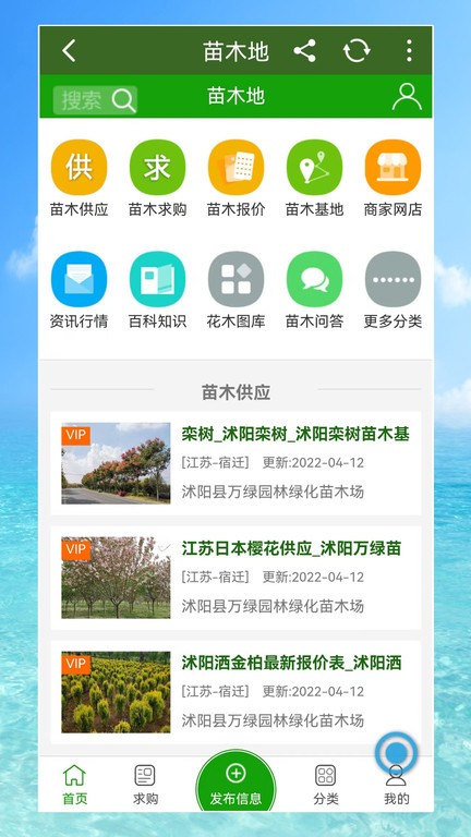 4、简便的信息分享通道,完全可以将自己看到的诸多苗木信息以及商家信息发布出去给自己的好友苗木信息app是一个可以使用这款软件的手机端,用户下载注册之后就可以在本平台上选择自己需要的服务进行体验了,这里有各种不同的苗木供你选择,还有很多小伙伴们不知道苗木的信息和内容,想要了解更多功能的用户快来下载吧!
