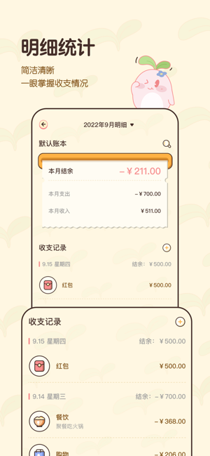 一款便捷好用的记账软件,随时随地记录个人开销和支出情况,快速进行财务管理、资产统计等操作,让用户能够更好地规划消费计划。