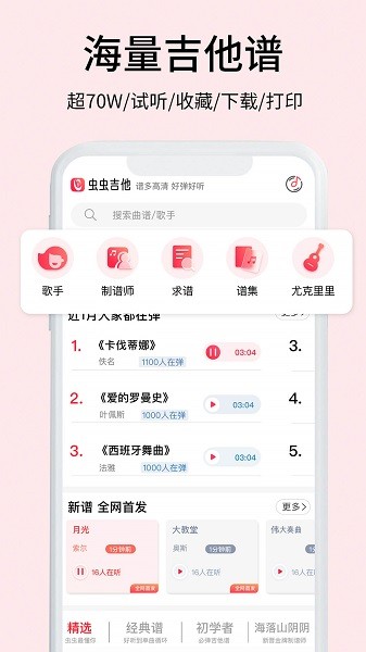吉他谱:虫虫吉他app提供大量吉他谱的信息,包括谱制、调音、弦库等。用户可以通过该软件了解吉他的基本演奏方式和音阶,帮助他们更好地掌握吉他的音准和音色。