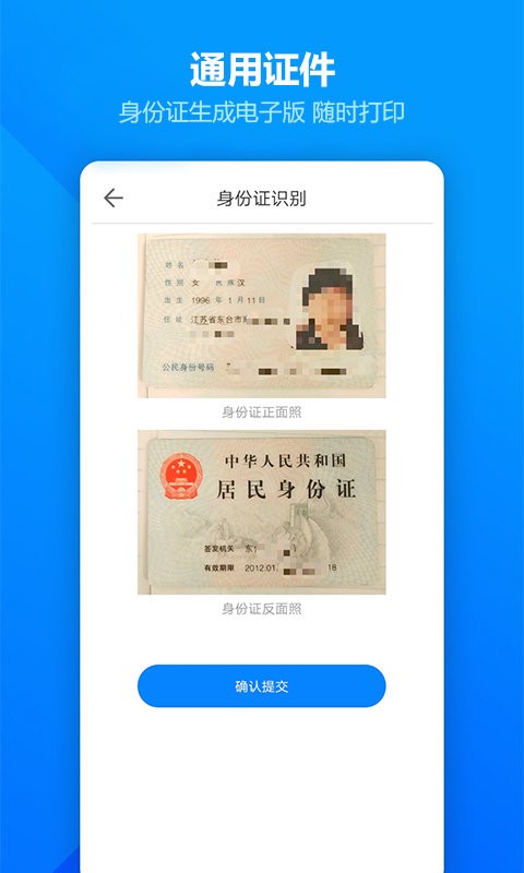 扫描身份证、银行卡、驾驶证、行驶证等各类证件,快速完成纸质资料签名、复印件录入、电子签名等一系列工作任务。