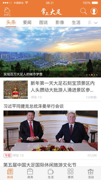 掌上大足部手机新闻更新为用户带来最新的新闻资讯,在手机端就能够查看最新最热门的新闻资讯内容哦,而且还有本地的各种生活服务功能哟,有需要的朋友可以试试。