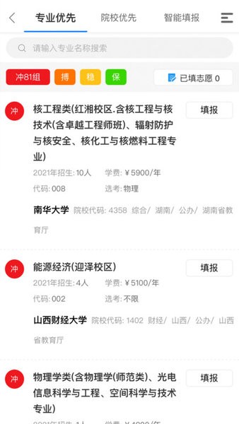 2、院校查询:可轻松查找各类院校,包括历年的招生简章、分数线、开设专业等等;