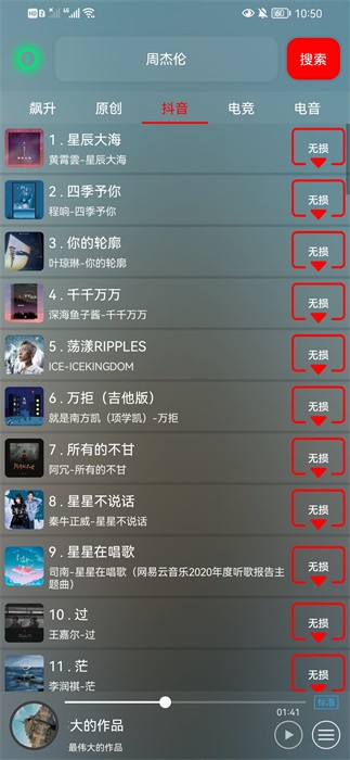 搜云音乐APP具备智能搜索引擎,通过输入歌曲名称、歌手名或专辑名即可快速找到您想听的歌曲;