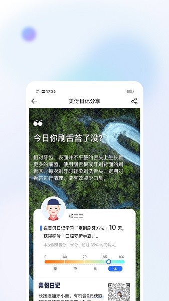 5、自定义设置相应的护眼方案提醒,防止过度沉迷;牙齿保护牙医健康状况信息填写便捷状态下完成“刷牙”,让牙医生和患者们能够在线交流互动,可以随时查看详细的牙牙知识内容哦。软件支持在线进行刷牙学习,还可以了解相关的牙口健康常识等功能。欢迎大家下载使用!