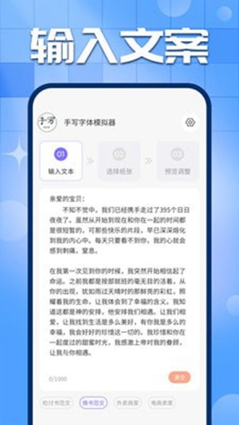 手写字迹模拟器是一款非常实用的手机字迹模拟应用,提供了丰富的字迹模板类型,涵盖了多种字帖风格和服务元素。它不仅适用于初学者或者有一定基础的用户来说,也可以帮助他们在短时间内提升他们的表达能力。
