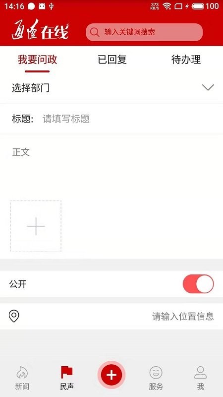 5、“问政”,请输入相关问题或联系我们!【城事发布】图文视频语音任意编辑发表至城事界面后点击发布按钮(可自行选择要发布的类型)