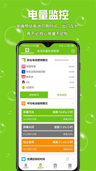 电流大小,电压等;电池电压,温度,湿度,能耗等详细的信息;电池容量检测管理器支持自动校准和手动校正;